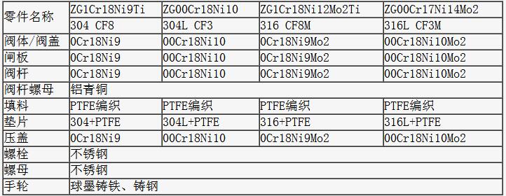 二、Z41W-16P(R) Z41W-25P(R) Z41W-40P(R) Z41W-64P(R)不銹鋼閘閥的主要零件材質(zhì):