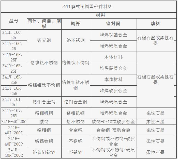 Z41楔式閘閥產(chǎn)品零部件材料