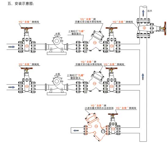 過濾活塞式預(yù)防水擊泄放閥該多用閥由一個(gè)Y型寬閥腔帶過濾器的主閥、一個(gè)三通式低壓導(dǎo)閥各一個(gè)三通式高壓導(dǎo)閥組成,當(dāng)意外斷電、水泵關(guān)機(jī)、水泵啟動(dòng)等情況時(shí),產(chǎn)生一個(gè)低壓波動(dòng),這時(shí)低壓導(dǎo)閥開啟與大氣相通,活塞上腔壓力下降,主閥開啟泄水,并在回水高壓到來時(shí),保持找開狀態(tài),當(dāng)管網(wǎng)壓力增至工況壓力時(shí),低壓導(dǎo)閥和主閥都緩慢關(guān)閉。